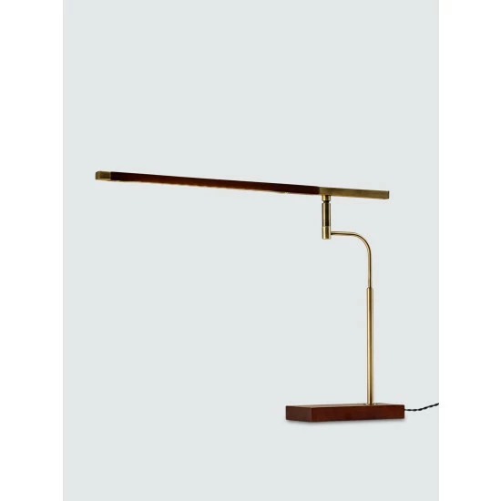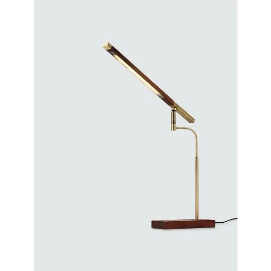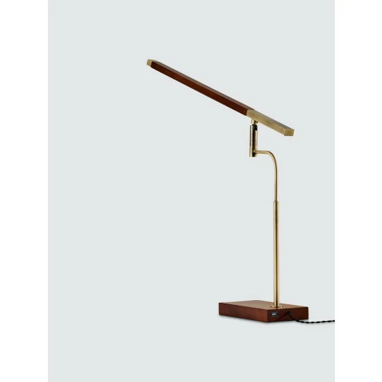 A thin silhouette with a small footprint, the Barrett LED Desk Lamp is perfect for the work space. A long, walnut wood shade that adjusts in all directions allows for light wherever it is needed on the desk. A 3-way touch switch is located on the edge of the shade for easy access. A 2 AMP USB port is located on the back of the base for easy access to charge up smart devices. With a walnut wood finish with antique brass accents, this desk lamp is as stylish as it is functional. A twisty black fabric cord comes neatly out of the back of the base. This desk lamp is not smart outlet compatible. The LED light is integrated into the lamp and is not replaceable, but it lasts around 50,000 hours.
