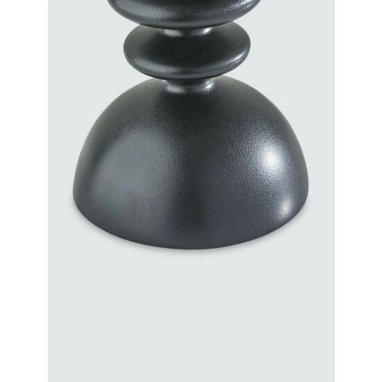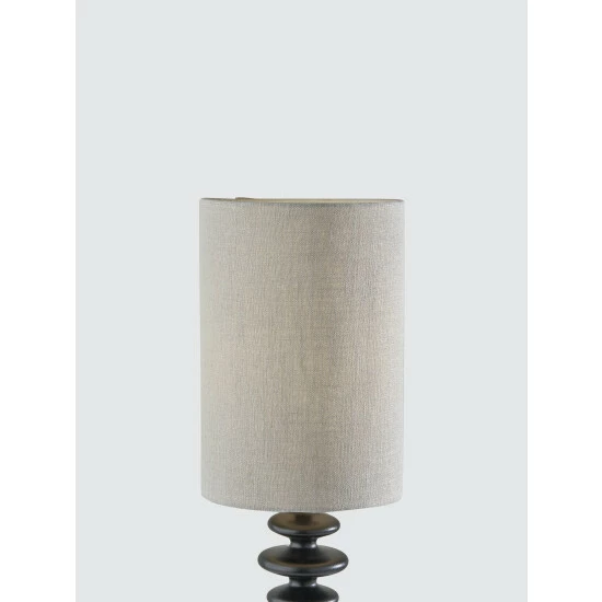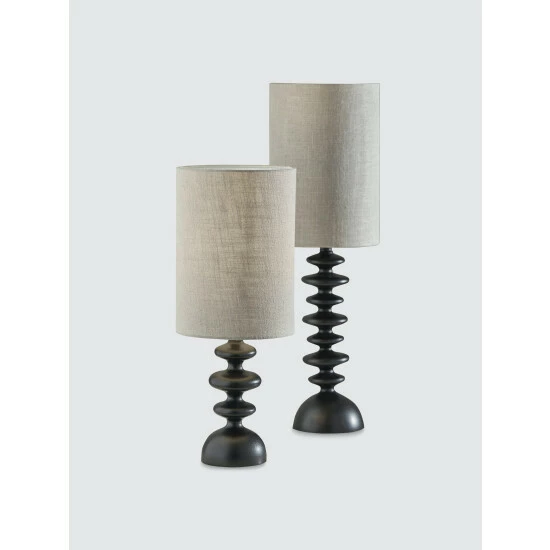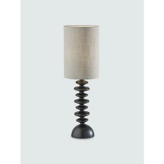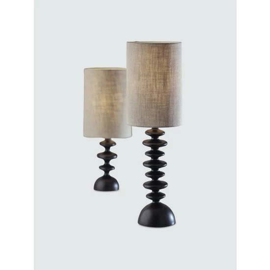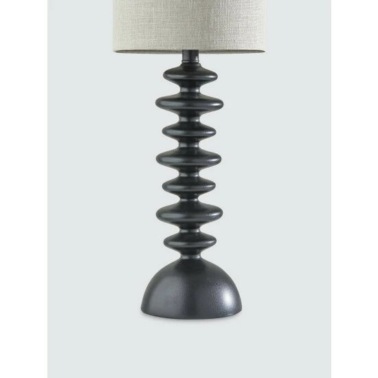 Bring elegant, contemporary style to your space with the unique silhouette of the tall Beatrice Table Lamp. This lamp is the perfect addition to nightstands or accent tables, featuring a dome-shaped base to ensure stability. The black matte finish continues up the distinctive stem, which includes seven round designs of varying sizes. The lamp is topped by a taupe textured fabric drum shade to softly diffuse light. Operated by a rotary socket switch to easily turn the lamp on or off, it is also powered by an extra lonh black cord. Complete your décor with the tall Beatrice Table Lamp.