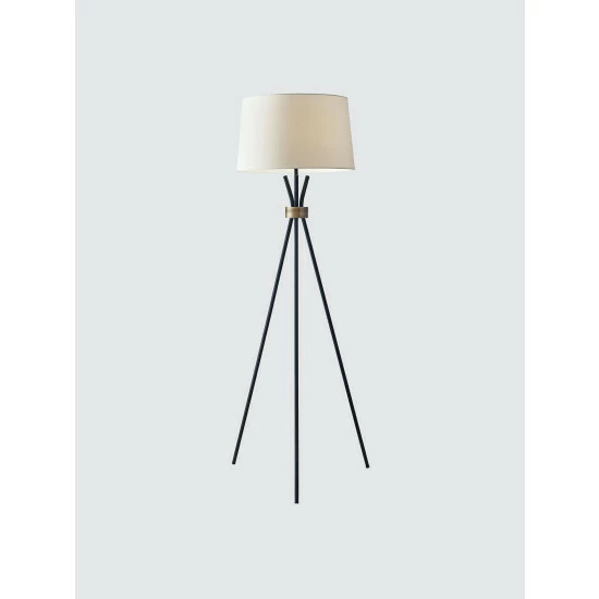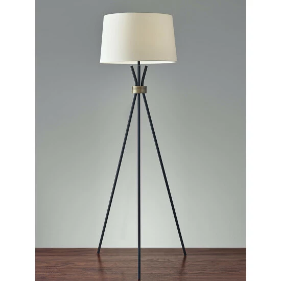 A stunning silhouette with mid-century elements, the Benson floor lamp is a tripod of black metal legs gathered at the neck with an antique brass accent. It is topped with a modified drum shade in contrasting off-white linen. A black fabric cord completes the modern statement. A three-way rotary switch is located under the socket. The 3-way rotary socket switch will only work with a 3-way light bulb. Otherwise, this lamp will function with simple on/off switch at its highest setting. This lamp is smart outlet compatible. Bulb is not included.