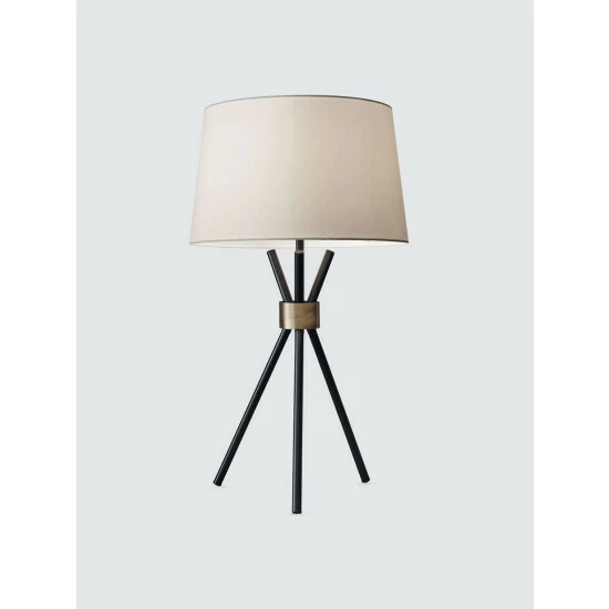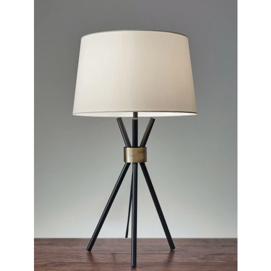 A stunning silhouette with mid-century elements, the Benson table lamp is a tripod of black metal legs gathered at the neck with an antique brass accent. It is topped with a modified drum shade in contrasting off-white linen. A black fabric cord completes the modern statement. A three-way rotary switch is located under the socket. The 3-way rotary socket switch will only work with a 3-way light bulb. Otherwise, this lamp will function with simple on/off switch at its highest setting. This lamp is smart outlet compatible. Bulb is not included.