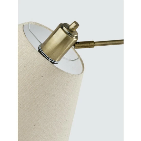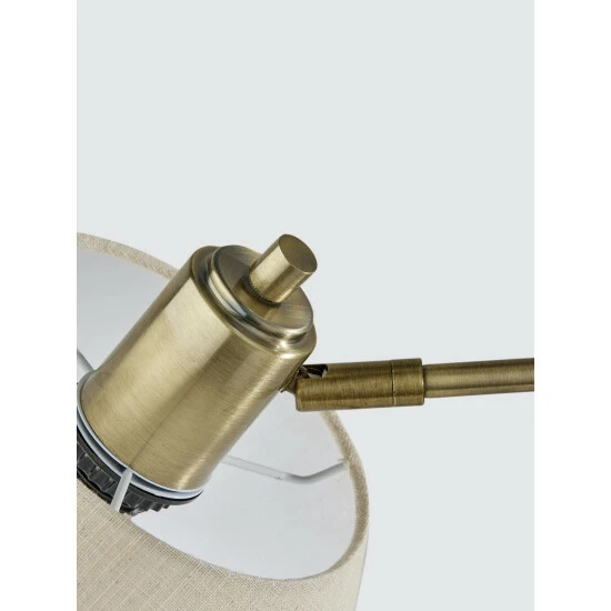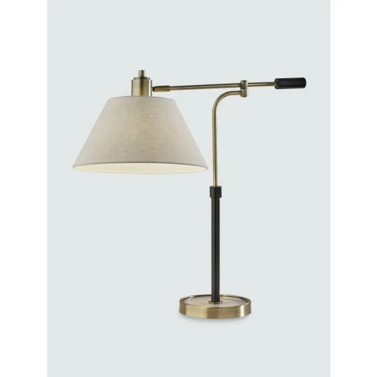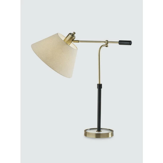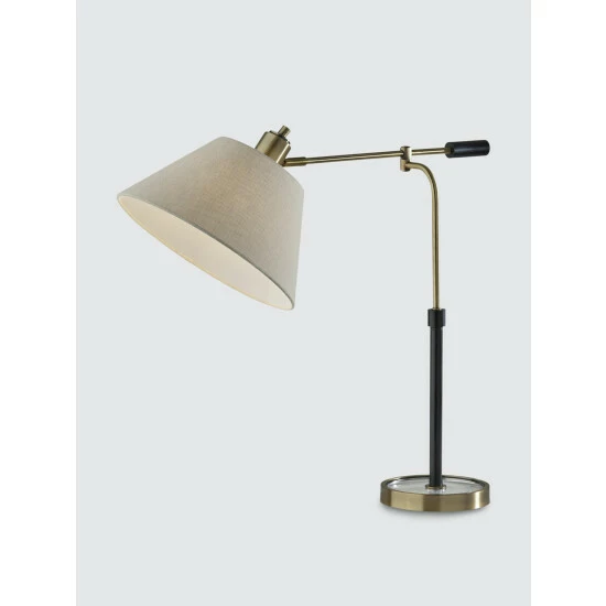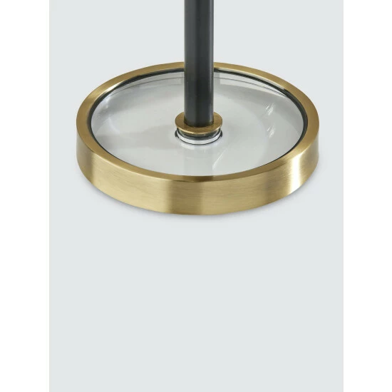 With an elegant blend of form and function, the Bryson Table Lamp brightens your space with an industrial flair. Featuring a mixture of black and antique brass finishes and a textured fabric shade, this table lamp includes pivot points on both the stem and the base of the shade, allowing you to direct the light wherever it’s needed. For even greater versatility, the lamp is operated by a three-way rotary switch so you can turn the bulb to high, medium, low or off. The lamp also features a round glass base with an antique brass frame and is powered by a long clear cord. Complete your space’s look with the classic Bryson Table Lamp.