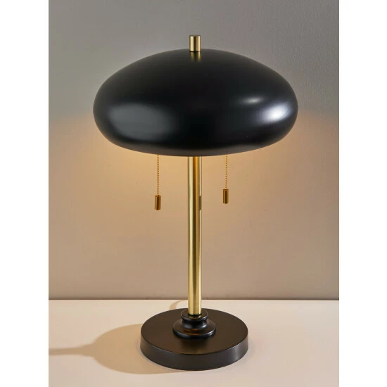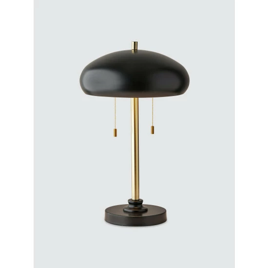 Add a mid-century accent to your bedroom, living room or office space with the Cap Table Lamp. A black metal dome shade has a gold painted inside for optimal light reflection. Two sockets each hold a standard 40W bulb, each controlled by its own pull chain switch providing 2 brightness settings. Black and antique brass finishes are mixed to create a versatile, modern look.