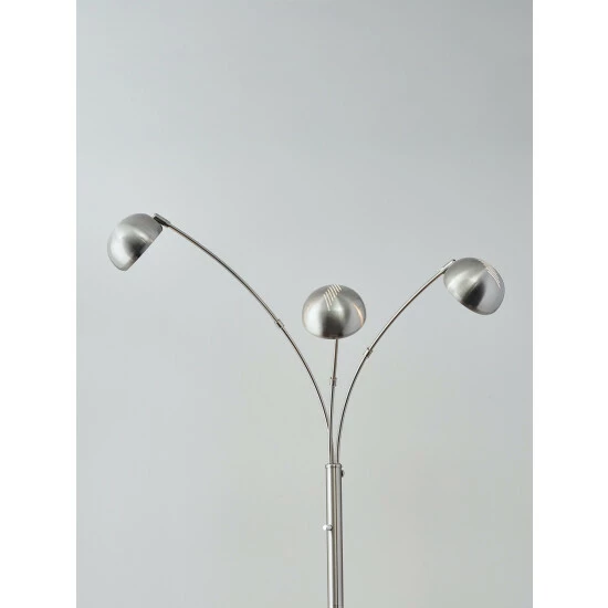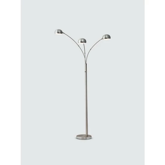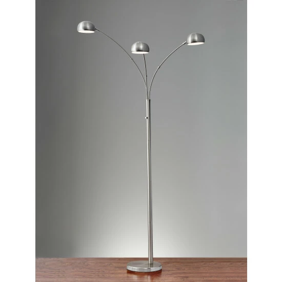 A trio of satin steel shades direct light from the Domino arc lamp to illuminate a room or sectional. At seven feet high, it stands out of the way while the three shades adjust horizontally to even light distribution. Despite their smaller size, the shades each hold a 40 Watt high intensity bulb for plenty of illumination. These three candelabra bulbs come included with the lamp. A rotary switch located on the pole turns the lamp on and off. This lamp has a black cord and is smart outlet compatible. Bulbs included.
