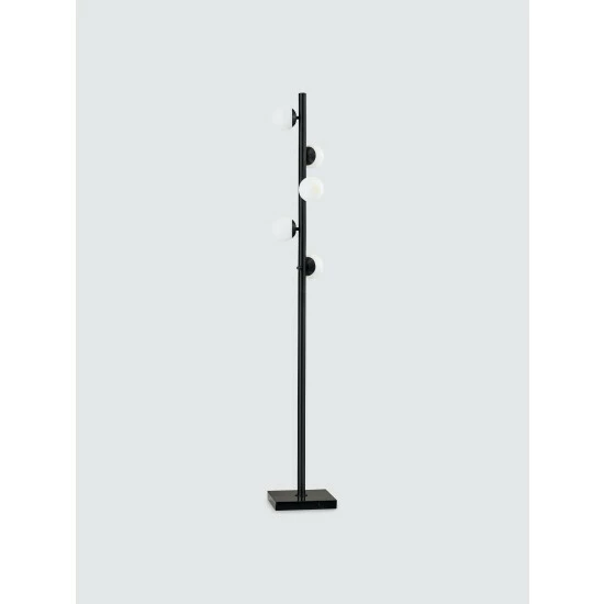 The Doppler LED Tree Lamp has mid-century modern inspiration. Five white opal glass globe shades are scattered along an antique brass pole. A square black marble base serves as a decorative accent as well as a heavy weight to keep this lamp sturdy and safe. This floor lamp ships with five G9 replaceable LED bulbs that give off a total of 1,000 lumens of warm, ambient lighting. The sleek look is finished off with a black fabric covered cord. Bulbs are included. This lamp is smart outlet compatible.