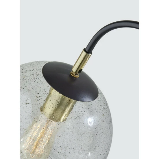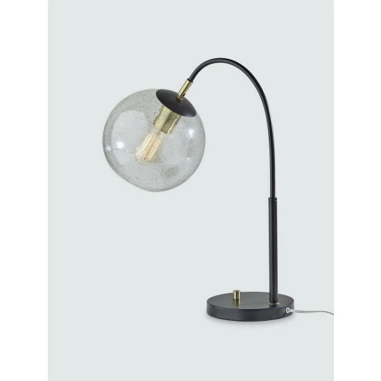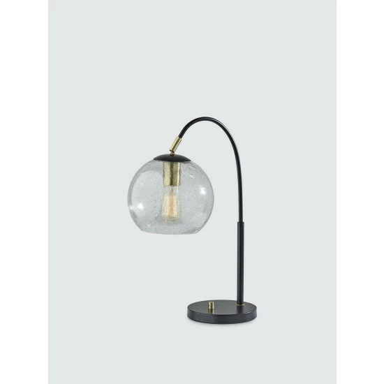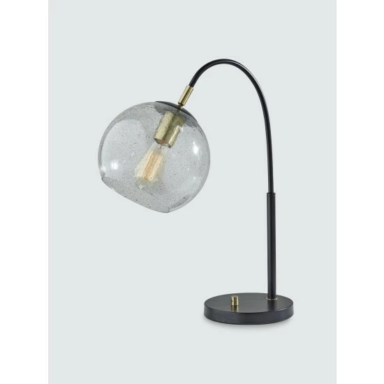 Warm, rustic elements like vintage-inspired glass and a dark bronze finish with brass accents are reimagined with a modern flair in the Edie Table Lamp. A great addition to desks, tables and countertops, the lamp’s speckled glass orb shade casts a warm light and is ideal for highlighting an Edison-style light bulb. This lamp also features an articulation point at the base of the shade, allowing you to direct the light wherever it’s needed. With clean and simple style lines, the slender, arcing metal stem in a bronze finish leads to the sturdy, round base. You can easily turn the lamp on or off with the brass rotary switch located on the base, while the lamp is powered by a long clear cord. Complete your home’s décor with the vintage Edie Table Lamp.