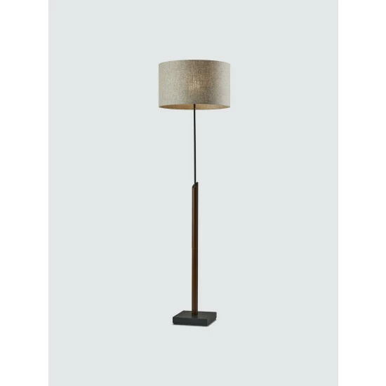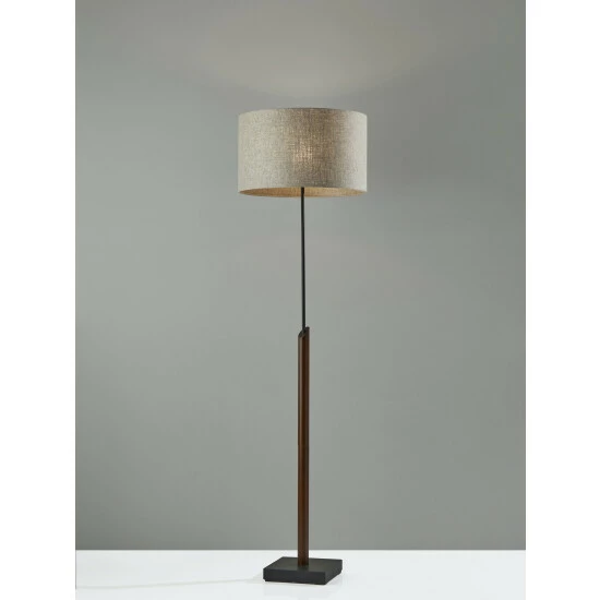Crafted from walnut wood and black metals, the Ethan Floor Lamp is a versatile, mid-century modern style that looks good in any space. A natural textured fabric shade balances out the look. With a 10 square base, this lamp has a compact profile to sit wherever light is needed. A black fabric covered cord comes out elegantly from the base. Bulb is not included.