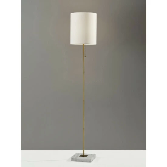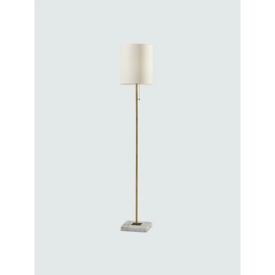 A simple silhouette is updated with high quality materials with the Fiona Floor Lamp. A square, white marble base keeps the lamp sturdy and strong while adding elegance to the look. Antique brass metal is softened with a white fabric shade that reveals its beautiful subtle texture when lit. Turn the lamp on and off with a simple tug of the pull chain switch. A clear, barely there cord trails neatly from the base.