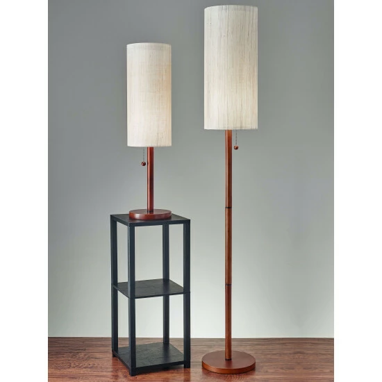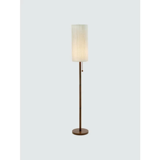 With a nod to Scandinavian and mid-century modern aesthetics, the Hamptons floor lamp pairs a wooden pole with a walnut finish and a tall, double cylindrical shade. A wood ball on the pull-chain completes the statement. With its warmer fashion elements, this floor lamp makes a great addition to the den or more casual interiors. This lamp has a black clear and is smart outlet compatible. Bulb is not included.