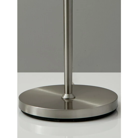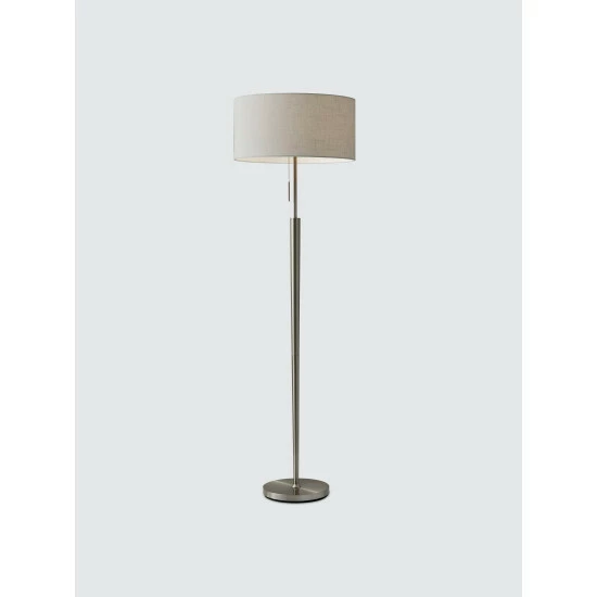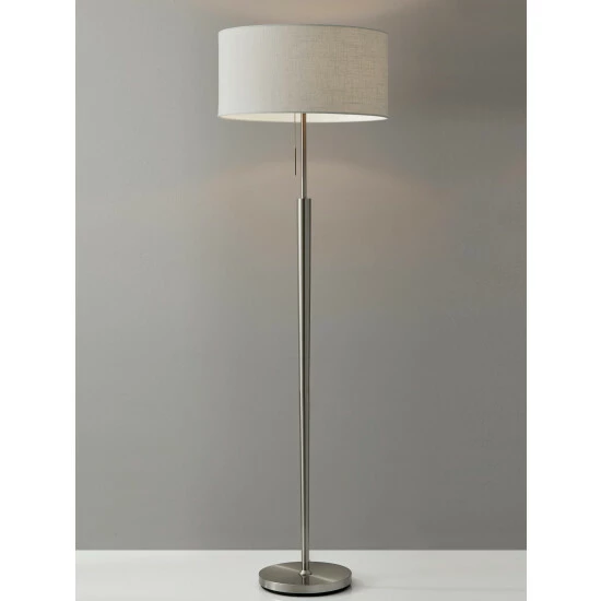 Simplicity meets modern in the elegant Hayworth floor lamp. A beautifully textured white linen drum shade is paired with a tapered brushed steel pole. This timeless style is perfect for a living room, bedroom, office or den. A pull chain switch easily turns the lamp on and off. This lamp has a clear cord and is smart outlet compatible. Bulb is not included.