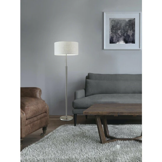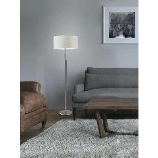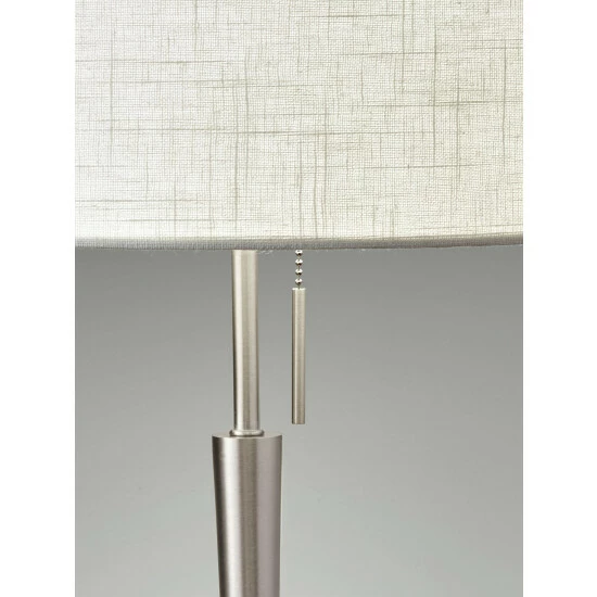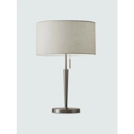 Simplicity meets modern in the elegant Hayworth table lamp. A beautifully textured white linen drum shade is paired with a tapered brushed steel pole. This timeless style is perfect for a living room, bedroom, office or den. A pull chain switch easily turns the lamp on and off. This lamp has a clear cord and is smart outlet compatible. Bulb is not included.