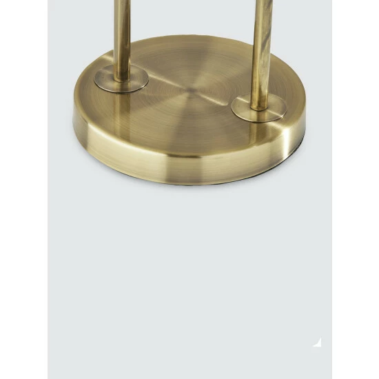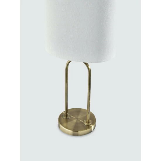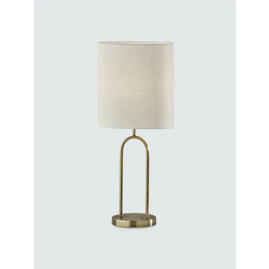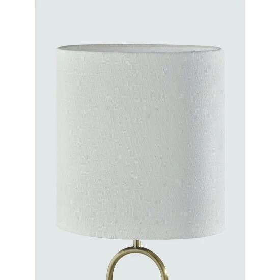 Defined by its sleek, balanced structure and contemporary design, the Joey Table Lamp is the perfect addition to nightstands, accent tables or end tables. Featuring a stylish antique brass finish, this tall table lamp has a round base with two thin tubes that form a unique arc design. Topping the lamp is a tall, oval shade made of off-white textured fabric that softly distills the light. Operated by a rotary socket switch to easily turn the lamp on or off, it is powered by a long clear cord. Complete your décor with the chic Joey Table Lamp.