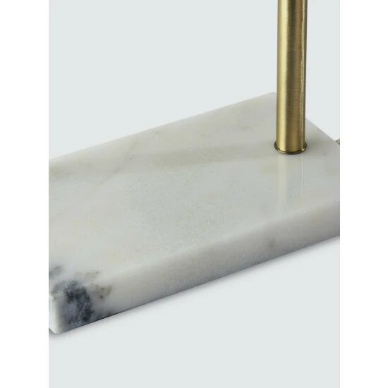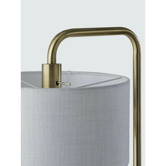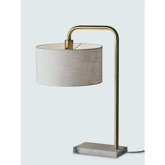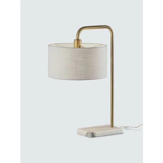 Illuminate your desk, table or nightstand in mid-century style with the Justine Table Lamp. Crafted with a blend of high quality materials, this tab;e lamp features a marble rectangular base supporting a slender L-shaped antique brass stem. A textured drum shade softly disperses light, while the lamp is easily turned on or off with a rotary socket switch. Complete your home décor with the classic Justine Table Lamp.