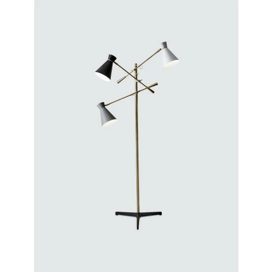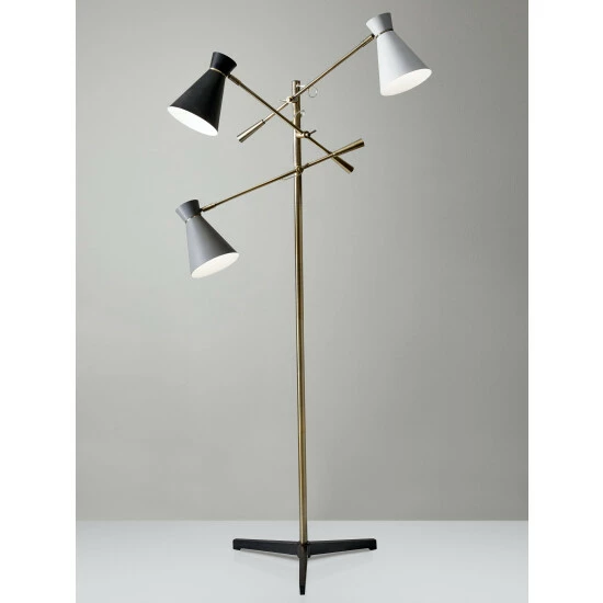 Mid-century modern styling is mixed with retro shapes in the Lyle 3-Arm Floor Lamp. This lamp serves not only as a functional, task floor light but also as a statement piece of décor featuring shades of differing colors black, white and grey. Each arm is adjustable, allowing for light to be directed wherever it is needed. An antique brass finish and a cast-iron tripod base add to the contemporary design. A brass rotary switch located on the top of each shade turns each shade on and off. This lamp has a clear cord and is smart outlet compatible. Bulbs are not included.