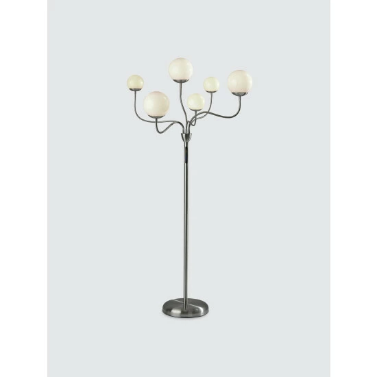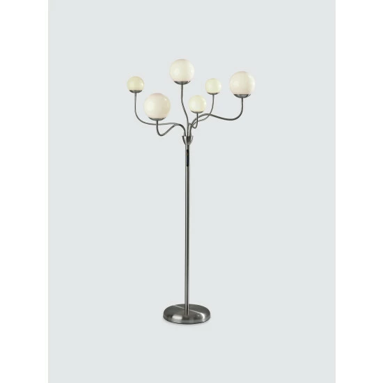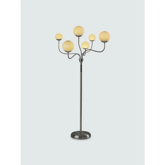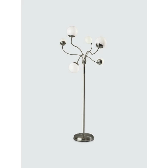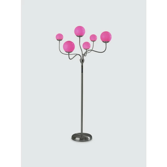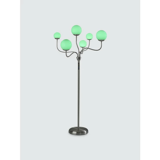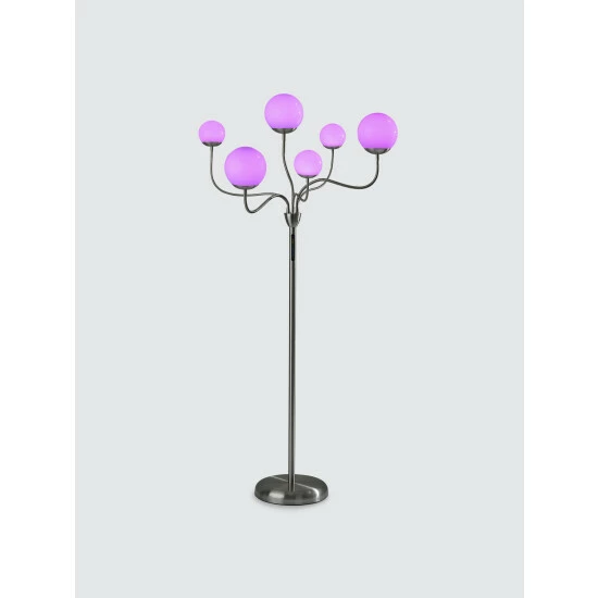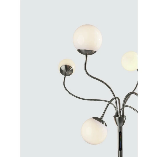 With a contemporary, versatile design and sleek color-changing LED functionality, the Phoebe Floor Lamp is the ideal addition to bedrooms or living spaces. It features a round, brushed steel base supporting a matching thin, tall pole. Branching from the pole are six adjustable arms that can be twisted and angled in any number of ways to create a design to suit the needs of your room. At the end of each arm is a unique plastic globe, three of which are large and three of which are small. The globes house integrated LED lights that are easy to adjust and provide a full spectrum of color options. A touch switch with a three-step dimmer is located on the pole, giving you the ability to set the brightness and lighting color to suit your mood.