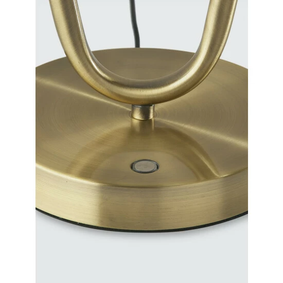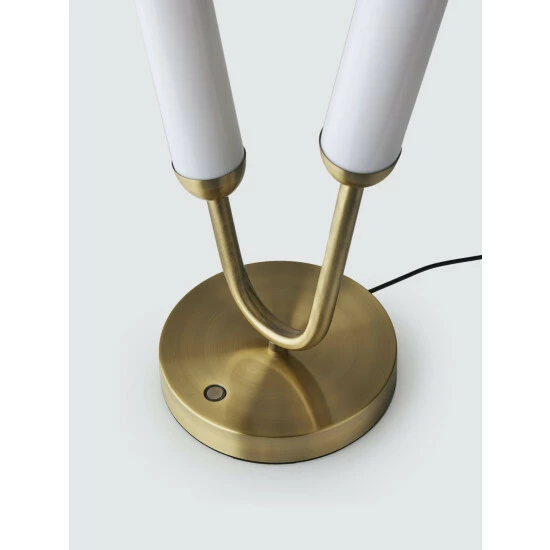 The Pierce LED Table Lamp’s blend of materials and stunning reed design creates a unique statement piece for any space. With a round base in an antique brass finish, the lamp features two short and slender poles, each leading to a frosted cylindrical shade. Each light is an integrated LED light controlled by a touch switch located on the base, giving you the ability to select between three brightness levels at the touch of a finger. Complete your home décor with the unique Pierce LED Table Lamp.