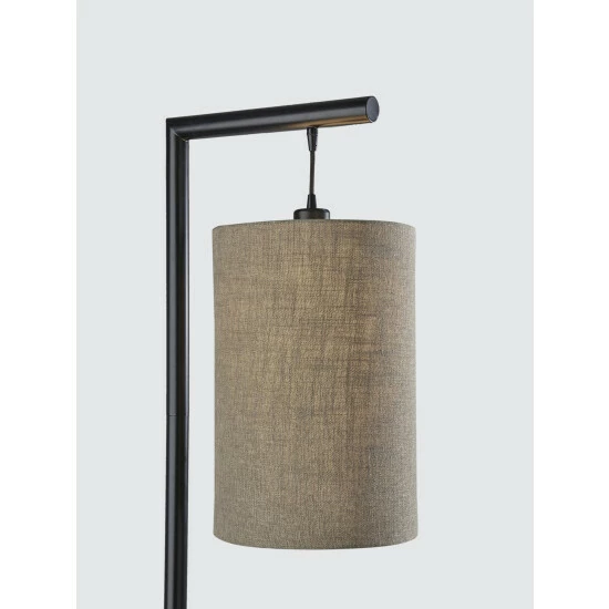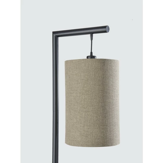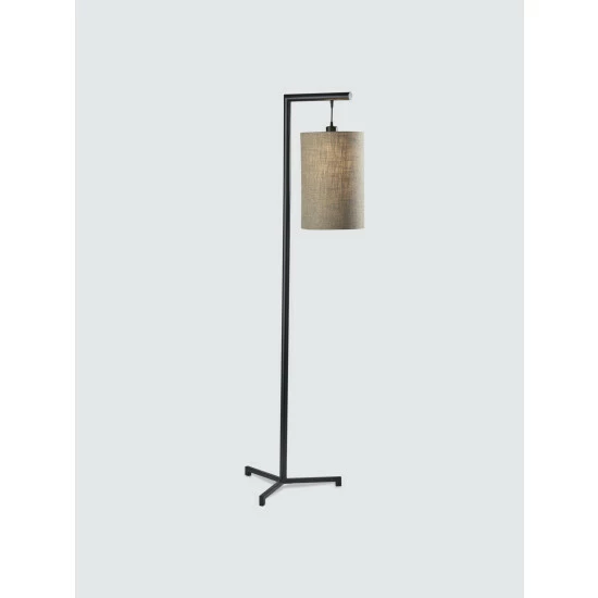 Add mid-century style and ambient task lighting to your space with the Reggie Floor Lamp. This space-efficient lamp fits conveniently in corners and behind or beside furniture. With a black metal finish, the base forms a low triangle shape leading to a thin stem. Hanging by a short cord covered in black fabric is a tall drum shade, while the light brown textured fabric diffuses the light, softly illuminating your room. The lamp is operated by a rotary socket switch and is powered by a long cord covered in black fabric. Complete your décor with the antique Reggie Floor Lamp.