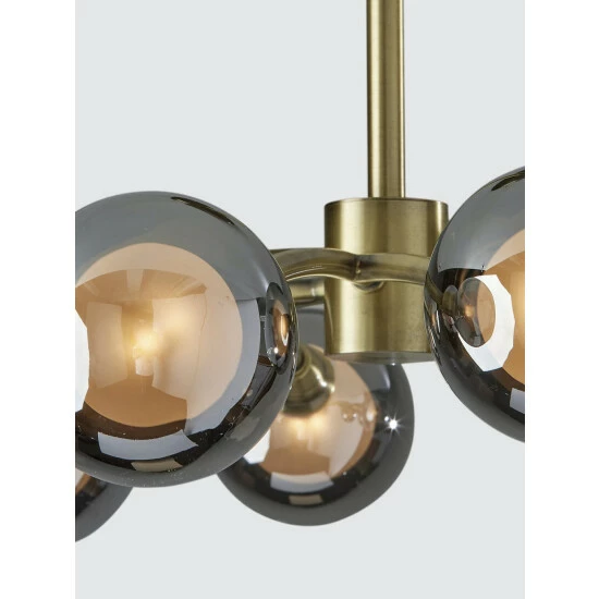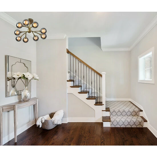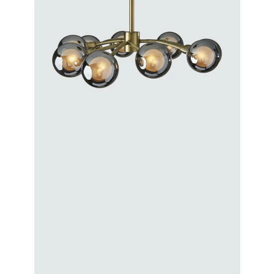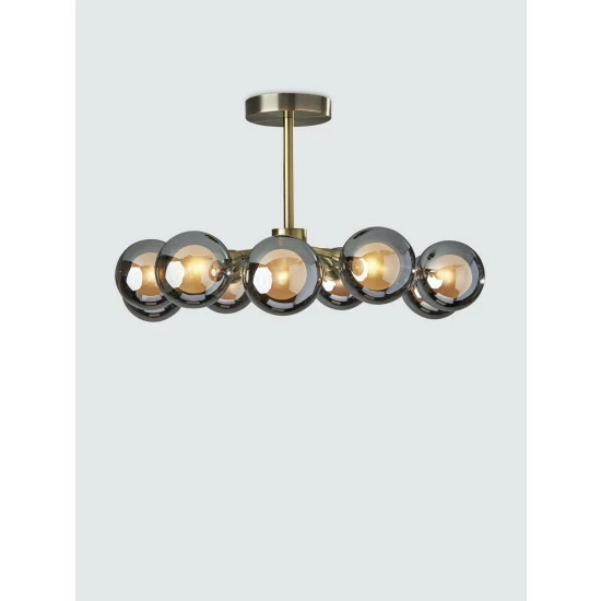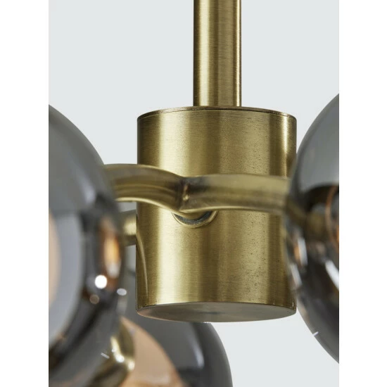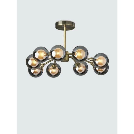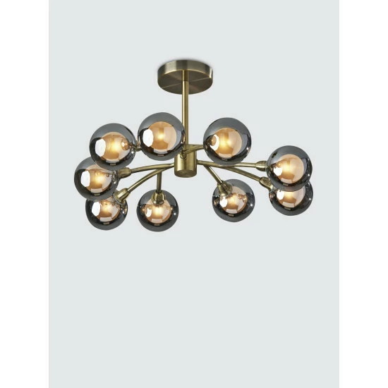 Add a fun and unique addition to entryways, kitchens and dining areas with the Starling LED Flush Mount Chandelier. Featuring a design that branches outward rather than down, this tall light is a perfect addition for rooms with lower ceiling heights. The antique brass finish on this chandelier contrasts beautifully with the Sputnik-style shades. Made of double-layer glass, the nine shades are frosted on the inside but smoked on the outside for a unique look, while the included LED bulbs are easily dimmable. The short antique brass stem leads to a matching base for a neutral, coordinating addition to any room.