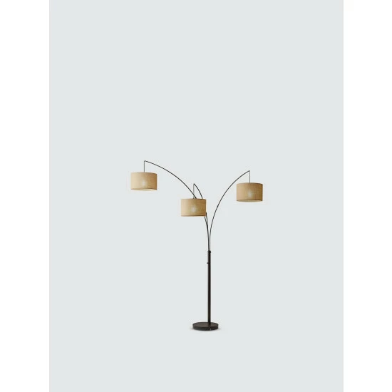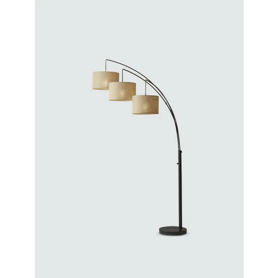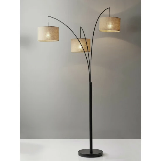 The contemporary Trinity Arc Lamp presents a stylish alternative to the typical arc lamp. A trio of white drum shades are suspended from brushed steel arms and controlled with a four-way rotary switch on the main pole. Three 100W incandescent bulbs or equivalent CFL’s provide enough light to brighten an entire room. This lamp has a clear cord and is smart outlet compatible. Bulbs are not included.