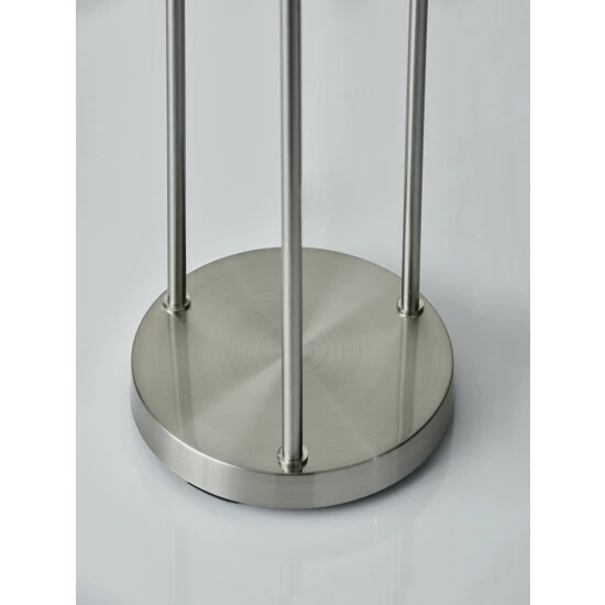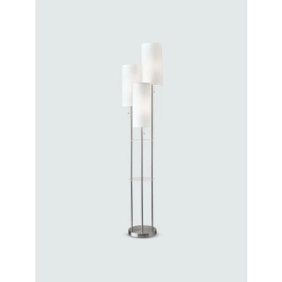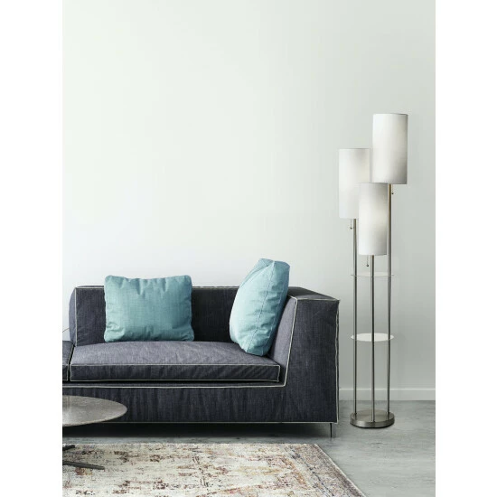 The Trio floor lamp offers plenty of light and offers easy storage solutions within a decorative yet small footprint. Three satin steel poles secured in a round base each hold a white linen cylindrical shade. The poles also support two clear acrylic shelves for display or storage purposes. Three pull chain switches control each of the three 40 Watt incandescent or equivalent CFL bulbs offering varying light settings. This lamp has a clear cord and is smart outlet compatible. Bulbs are not included.