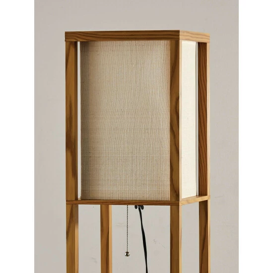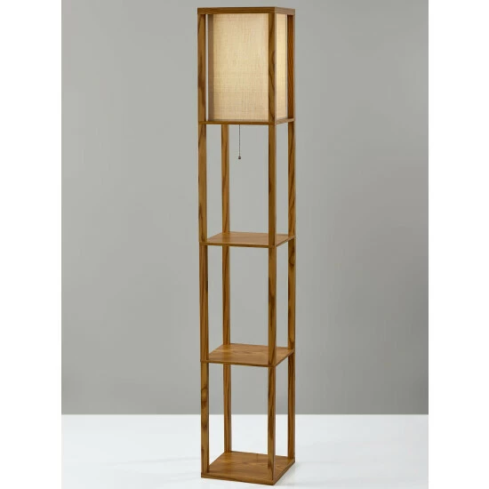 Have it all with style and multi-function. The Wright shelf floor lamp features a wood finished open box frame with two additional display/storage shelves, making it a handy addition to the living/media room, den, office or bedroom. The square natural textured shade diffuses light from a 150 Watt incandescent or equivalent bulb. The lamp has on/off functionality with a metal ball accented pull chain switch. This lamp has a clear cord and is smart outlet compatible. The lamp comes with clear wire clips for a clean look. Bulb is not included.