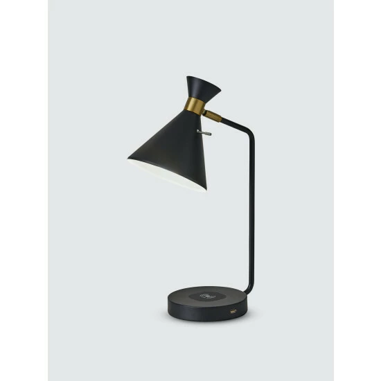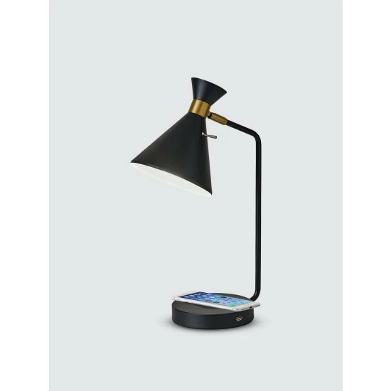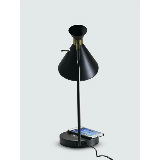 The Maxine AdessoCharge Table Lamp is a mid-century modern style table lamp with retro influence that includes a wireless charging pad with Qi inductive charging technology. Our product has been tested and verified to be safe and in compliance with the Qi standard. The AdessoCharge pad supports 5W charging on contact with the charging pad, which gets your phone from 0% to 100% in just 3-4 hours, depending on your phone model. A USB is located on the base and can charge up a second device simultaneously. AdessoCharge is unique in that you can use the AdessoCharge pad, the USB and the light all at the same time with maximum efficiency of all three. A simple rotary switch on the shade turns the lamp on and off.