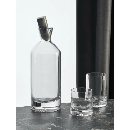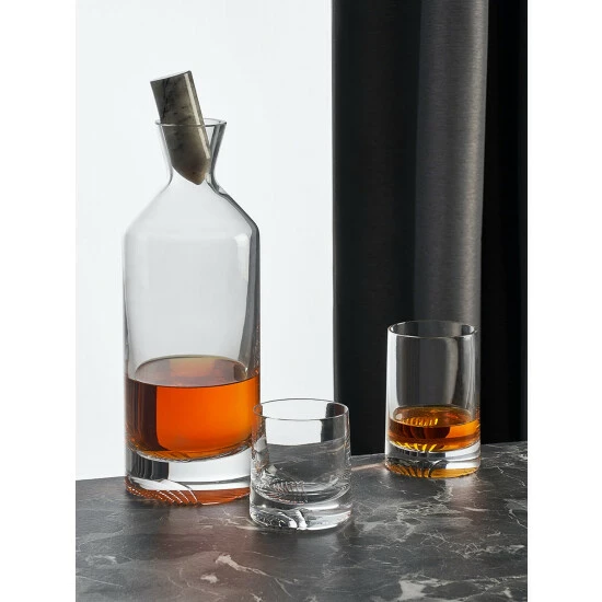 Short and heavy-bottomed, the Alba whiskey bottle by NUDE tapers towards the brim to preserve the spirit’s flavours and aromas. The minimal silhouette is crafted from lead-free crystal and features a hand engraved, deconstructed tartan pattern adorning the base, and a circular stopper which gently tilts in the conical neck of the carafe — an invitation to keep it pointing towards Scotland.