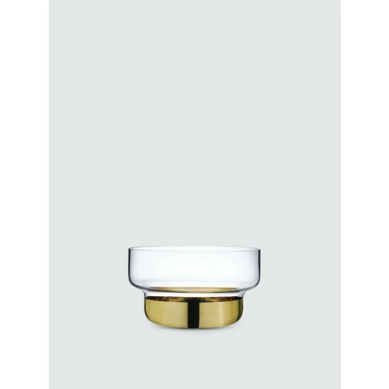 A series of durable and beautiful glassware objects, the Contour collection by NUDE comprises a wide range of crystalline vessels marked by a thick, contrasting rim which runs their circumference. This small bowl juxtaposes a clear top with a golden base.