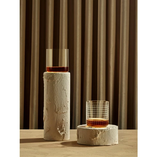Whatever the occasion, the NUDE Finesse set makes an excellent choice. Fusing sophistication with casual codes, the streamlined design is equally suited for both formal and relaxed occasions. The crystalline glass jug is accompanied by a practical cover and paired with two tumblers, defined by the subtle curvature of the base. Perfect for spirits and soft drinks alike.