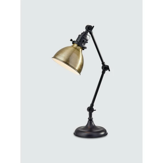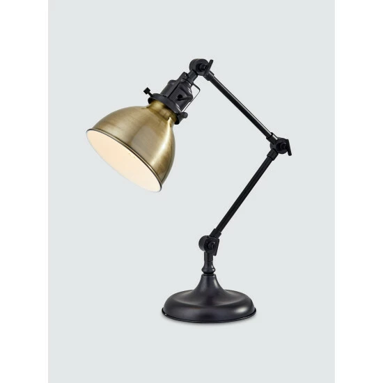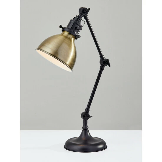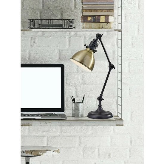 Light up your workspace in style with this Desk Lamp. Industrial detailing on the shade cup and joints elevate this classic task silhouette. A dark bronze finish provides a beautiful contrast to a warm antique brass finished metal shade. With three adjustable joints, it is easy to direct the light exactly where it is needed.