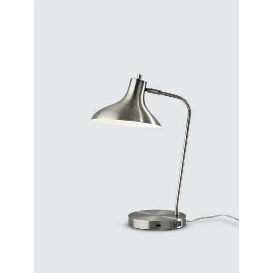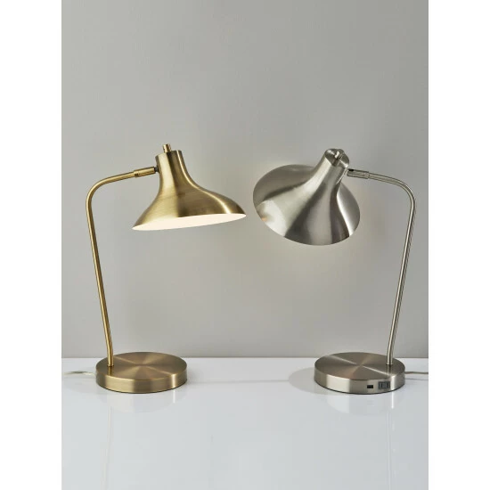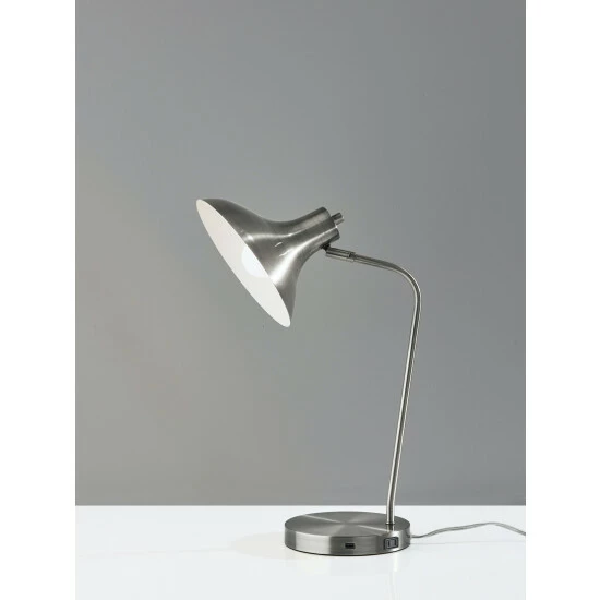 Add a functional and stylish addition to your space with the 19″ tall Cleo desk lamp by Simplee Adesso. Its clean, metal design and monochrome look perfectly complement modern and industrial décor. The lamp features a monochromatic metal construction in finish with a round base and slender stem, while the shade adds an unconventional shape with its large 9 1/2″ oval opening. For directional lighting options, the lamp offers an articulation point at the base of the shade, allowing you to direct the light wherever it’s needed. The lamp also has an AC outlet built directly into its base for convenient access to power right from your desktop. Whether the lamp is turned on or off, the AC outlet will keep working normally. Operated by a rotary switch located on the shade, the lamp powers a 40W bulb (not included) and features a 5′ clear cord. The Cleo desk lamp is also available with a finish.