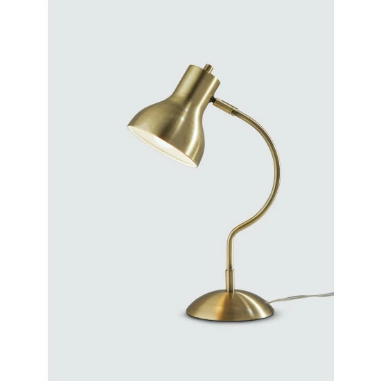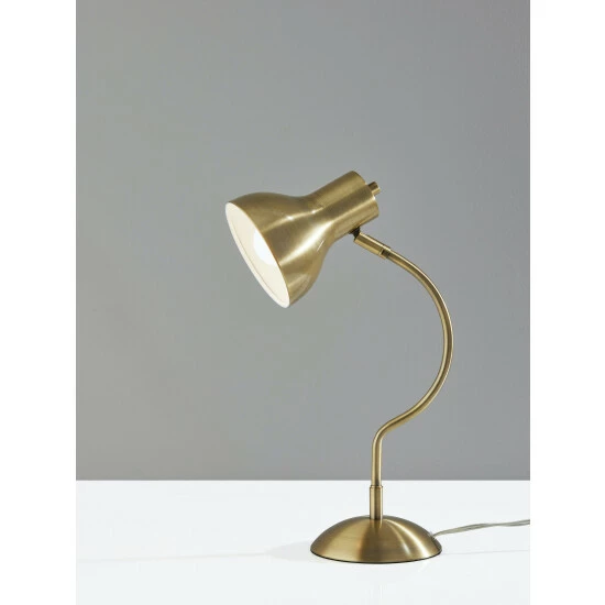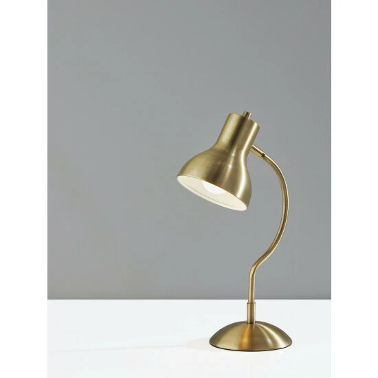 The mid-century modern Elmhurt desk lamp by Simplee Adesso is a study of coordinating curves and style lines in and brushed steel finish. The dome-shaped metal base in black finish is the perfect complement to the bell-shaped black shade. Connecting the two is a slender, arcing brushed steel stem that brings a distinctive silhouette to the piece. For directional lighting options, the 17 tall desk lamp offers an articulation point at the base of the shade, allowing you to direct the light wherever it’s needed. Operated by a rotary switch located on the shade to easily turn it on or off, the lamp powers a 40W bulb (not included) and features a 5′ black cord. The Elmhurst desk lamp is also available with an all-over antique brass finish for a more vintage feel.