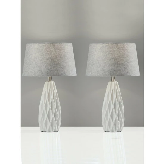This functional and fashionable set of table lamps will liven up your console table or bedside. The white ceramic base has a unique geometric silhouette while the grey fabric shade reveals its beautiful texture when lit up. Turn the lamps on and off with a convenient switch on the socket. All Adesso lighting products are either UL or ETL listed, meaning that they have been tested and approved to meet the government-regulated safety standards for the USA. Bulb is not included.