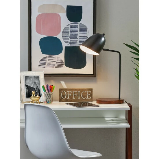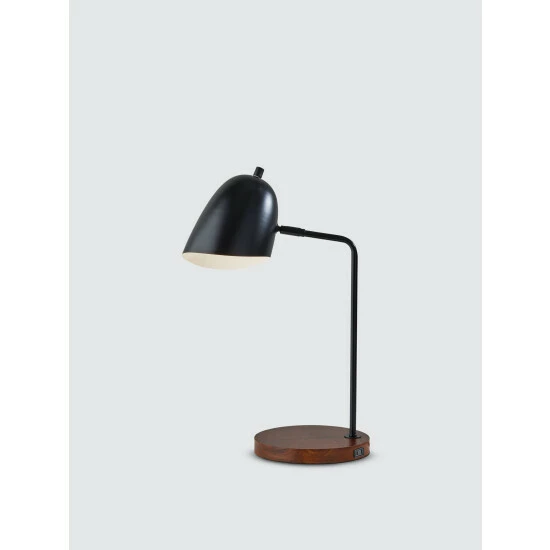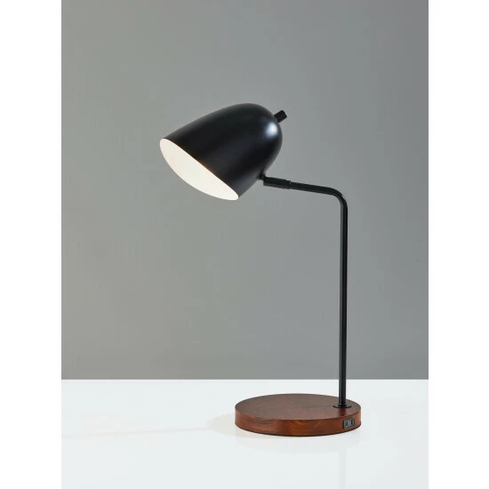 Taking its cue from mid-century modern and industrial designs, the Jude desk lamp by Simplee Adesso is the perfect addition to your home or office. The round 8″ diameter base is constructed of walnut rubberwood that beautifully complements the finish on the metal stem and curved bell-shaped shade. For directional lighting options, the 19 1/2″ tall lamp offers an articulation point at the base of the shade, allowing you to direct the light wherever it’s needed. The lamp also has an AC outlet built directly into its base for convenient access to power right from your desktop. Whether the lamp is turned on or off, the AC outlet will keep working normally. Operated by a rotary switch located on the shade to easily turn it on or off, the lamp powers a 40W bulb (not included) and features a 5′ black cord. The Jude desk lamp is also available with brushed steel metal and natural wood finishes.
